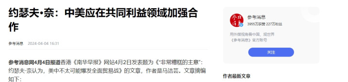 3、参考消息《约瑟夫·奈:中美应在共同利益领域加强合作》