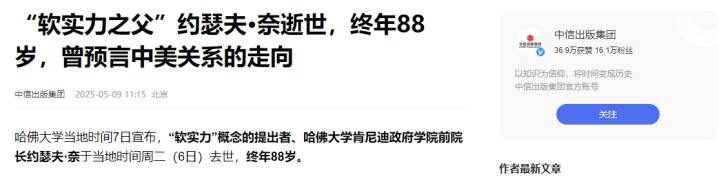 1、中信出版集团《“软实力之父”约瑟夫·奈逝世,终年88岁,曾预言中美关系的走向》